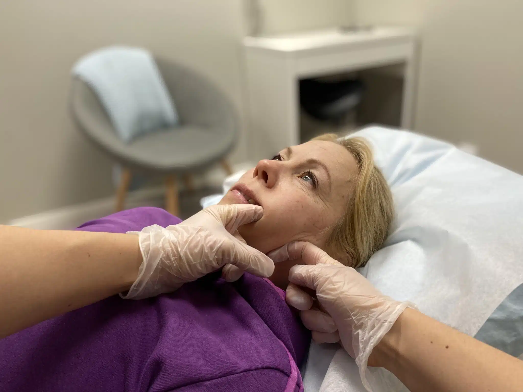 👉 Tuo peukalo leukaluun sisäpuolelle ja nojaa kevyesti. Käy läpi koko leukaluun reuna keskeltä sivulle päin.