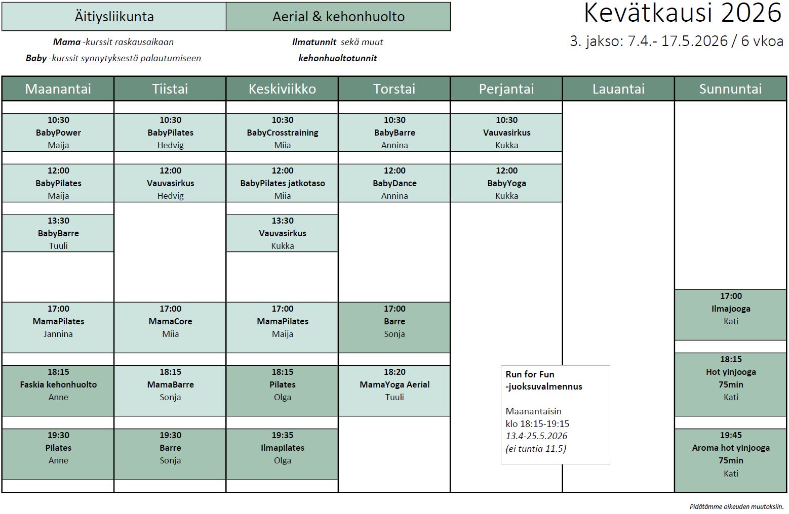 – poissaolojen korvausoikeus 5.5. saakka - 3.jakso: 7.4.-17.5.2026 (4-6 vkoa)