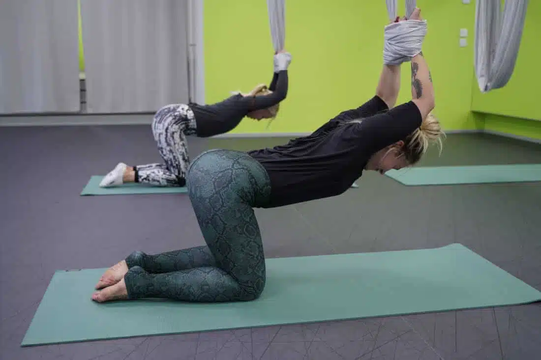 Ilmajoogakangasta käytetään apuna liikkeissä, jolloin se tuo lisätukea ja ohjaa liikkeen suuntaa. Kurssin edetessä päästään kokeilemaan monipuolisemmin erilaisia tapoja käyttää liinaa ja kokeillaan haastavampia asanoita. Kaikille löytyy sopiva versio ja voit aina jättää liikkeen edelliseen versioon. Asanoita ei tarvitse lähteä kehittämään haastavampaan, jos haluaa nautiskella edellisestä versiosta.